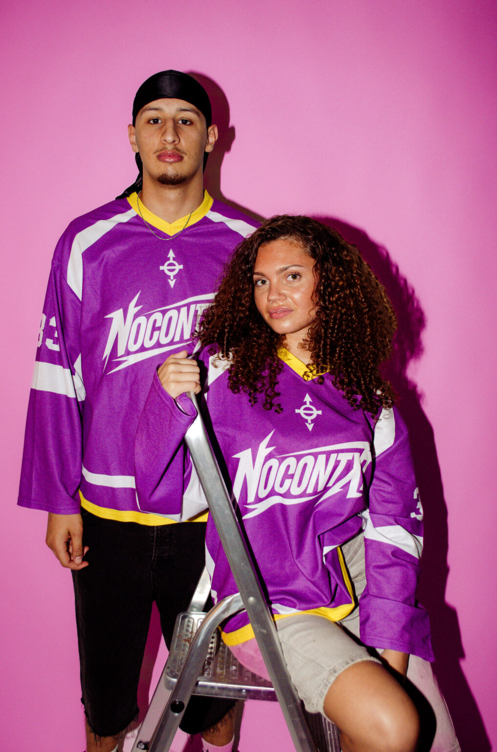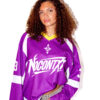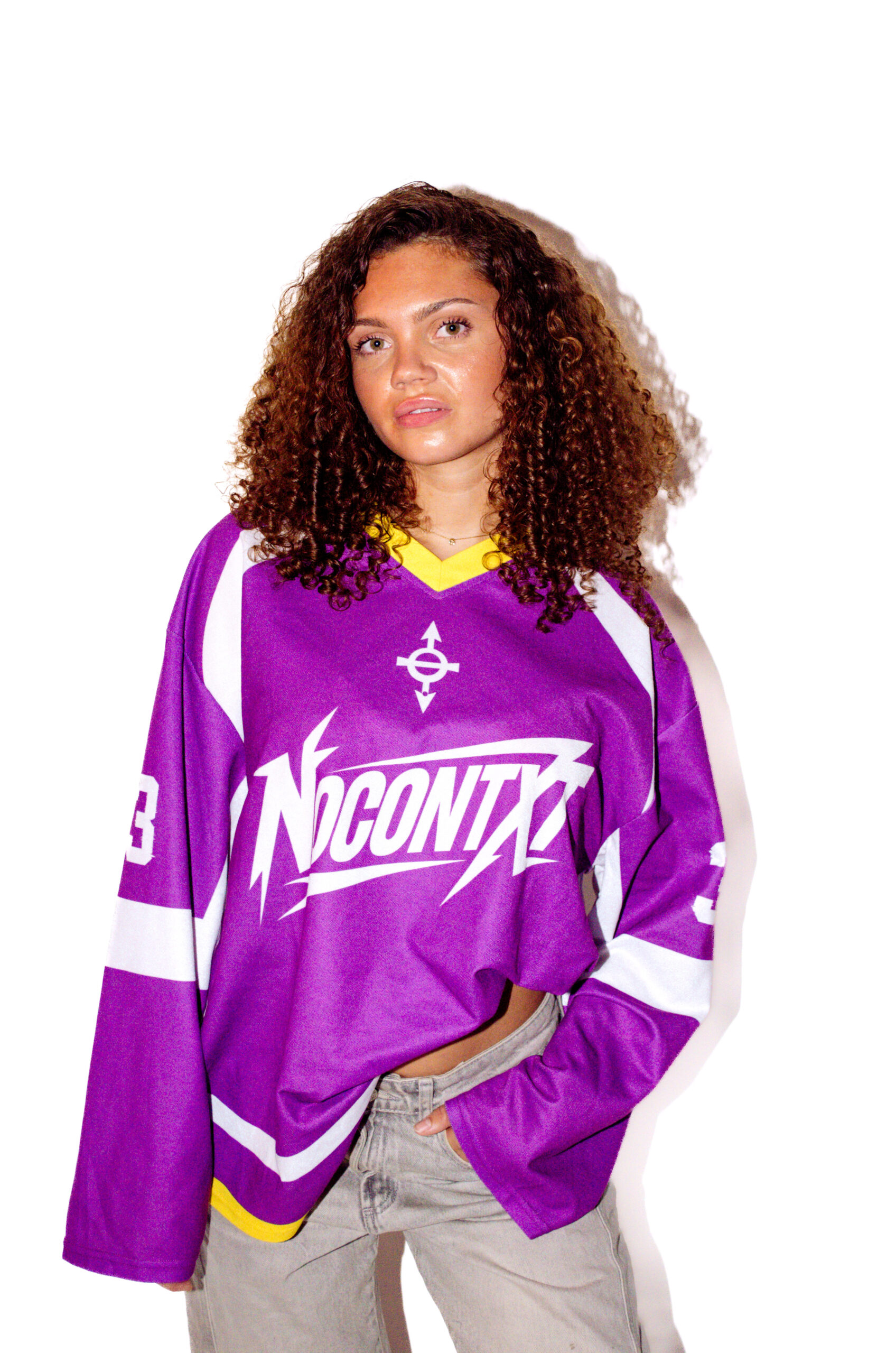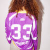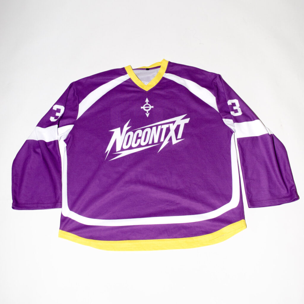 The deep amethyst-purple base paired with crisp white paneling and a vibrant yellow V-neck collar creates a striking contrast that captures the essence of the best nostalgia fused with modern streetwear energy. Finished with the NoContxt chest logo, #33 sleeve details, and signature branding, this jersey embodies movement, identity, and individuality.