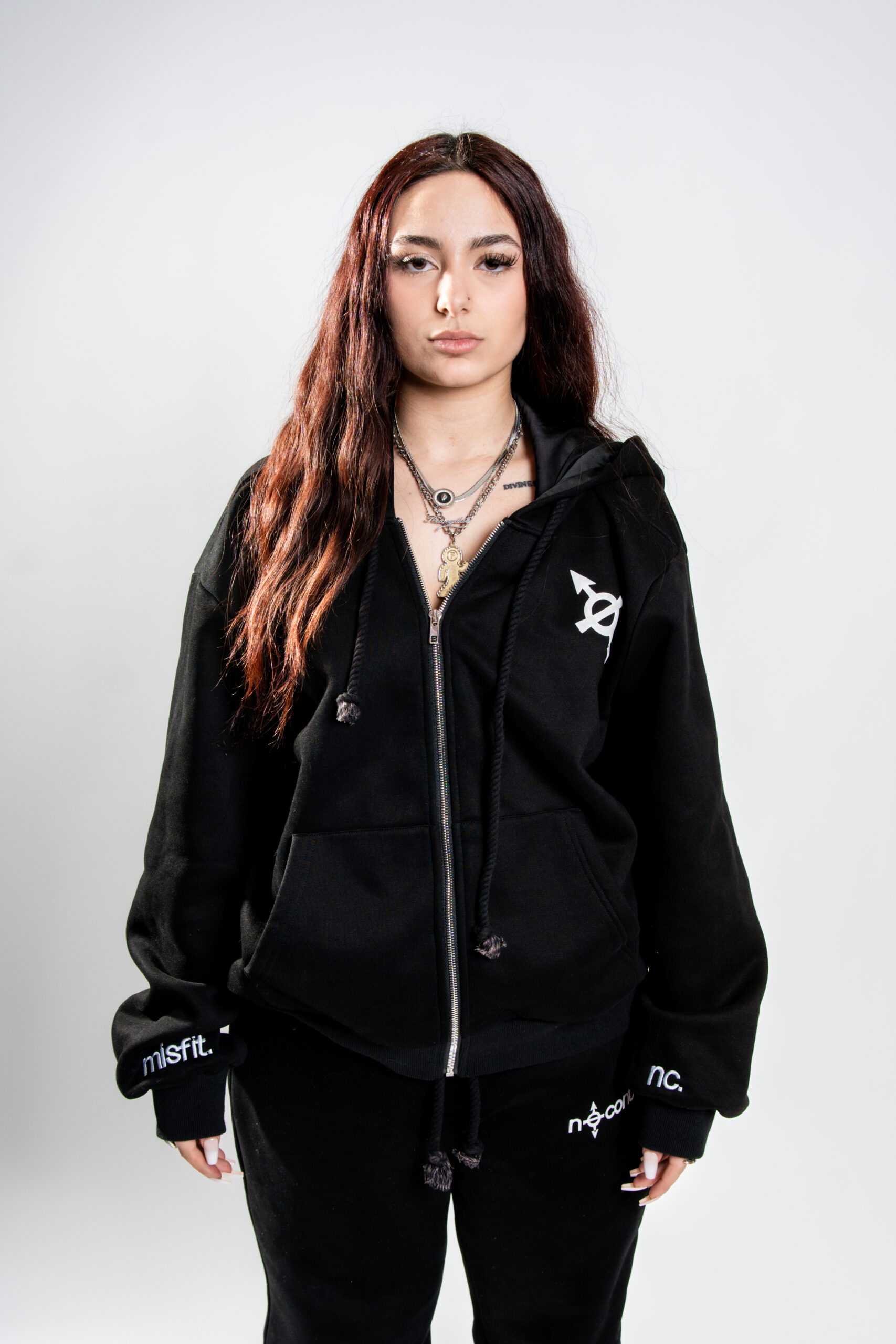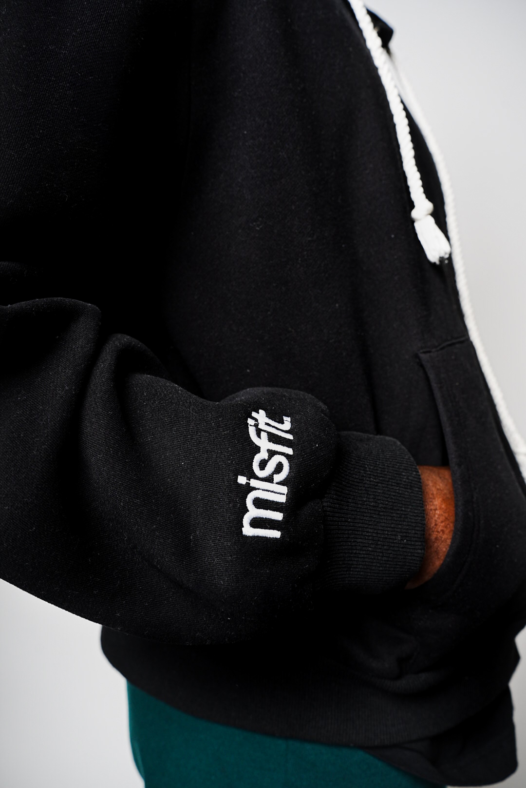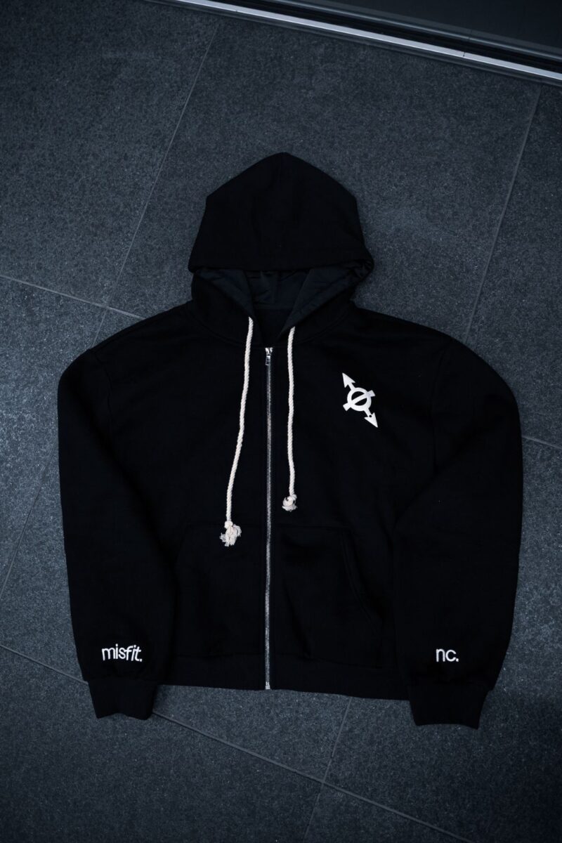 In deep black, this hoodie features “misfit” embroidery on the right sleeve, a minimalist ‘nc’ logo on the left, and a striking graphic on the chest.